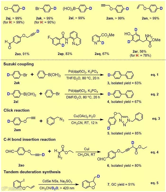 在此基础上,作者进一步发展了氘代硼酸、卤代物、炔烃、醛等一系列官能化氘代底物,并利用Suzuki偶联反应、Click反应和C-H键插入反应合成了复杂的氘代分子,为氘代药物的制备提供了一种可行的方案(图2,eq. 1-4)。例如,维生素B3(烟酸)是一种典型的抗高胆固醇血症药物,在2009年药物销售中排行前200名。作者通过碳-溴键至碳-氘键的转换,合成出该药物的氘代前驱体,后续通过酯水解反应合成了氘代维生素B3。该策略还可以通过一锅法的脱卤-自由基环化-氘化快速构建氘代苯并二氢呋喃衍生物,体现了该光氧化还原催化自由基合成策略的优势(图2,eq. 5)。