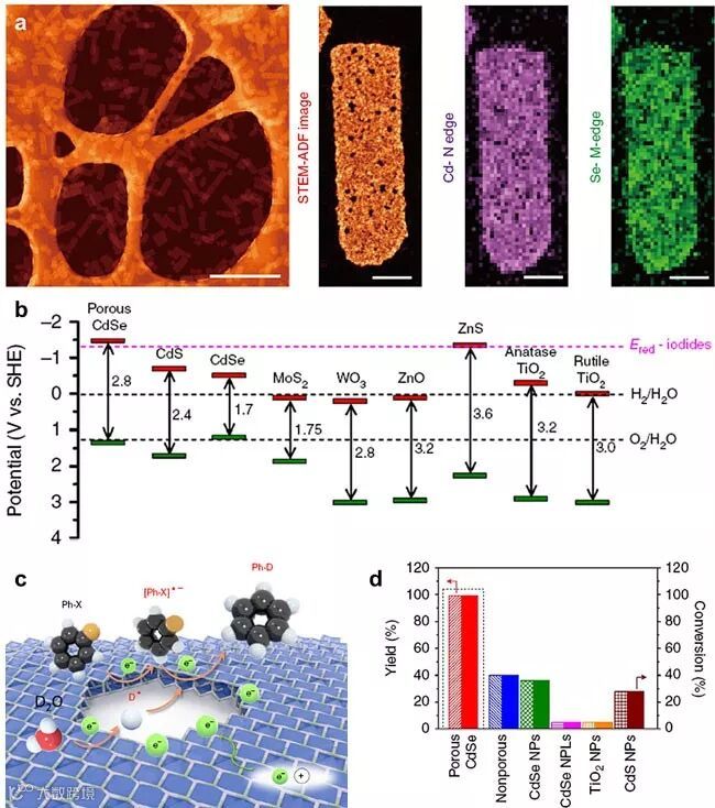 图2.(a)多孔CdSe纳米片的形貌及EELS成像;(b)典型光催化剂的能带位置与析氢电位、碘代物还原电位的比较;(c)可能的自由基反应历程;(d)不同催化剂对4-碘苯甲醚脱卤加氢的反应性能比较。
