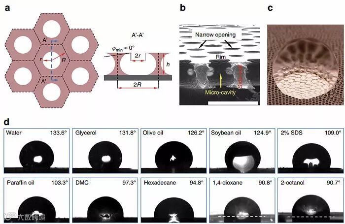 为了解决这些难题,香港大学的王立秋教授团队在结构设计和制备方法上同时进行创新。结构设计的灵感来源于跳虫,这是一种生活在土壤中的节肢动物,其生存环境经常遭受洪水和雨水的冲刷。为了对抗潮湿的环境和沙砾的摩擦,跳虫的表皮进化出独特的疏液性能和良好的耐磨性。电子显微镜图像表明跳虫的表皮覆盖了一层微纳米级别互相连接的蜂窝状空腔结构。空腔的截面呈现倒角结构,因此具备疏液的特性。结构的互连则赋予表皮良好的机械耐磨性。因此模仿跳虫表皮,他们提出互连的凹角结构:互相连接提高机械强度,凹角特点加强疏液性能。