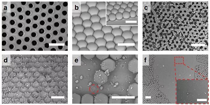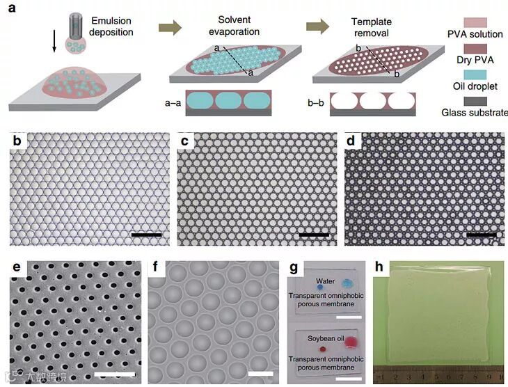 为制备该互连凹角结构,研究团队使用微流控液滴模板法制备疏液表面。微流控液滴技术可精确地控制微纳米级别液滴的产生,包括其大小、结构和成分。他们以液滴为模板,积少成多,可以大面积制备结构均一、成本低廉的疏液表面。由于微流控液滴尺寸均一可控,多孔薄膜的微结构也高度均一可控。
