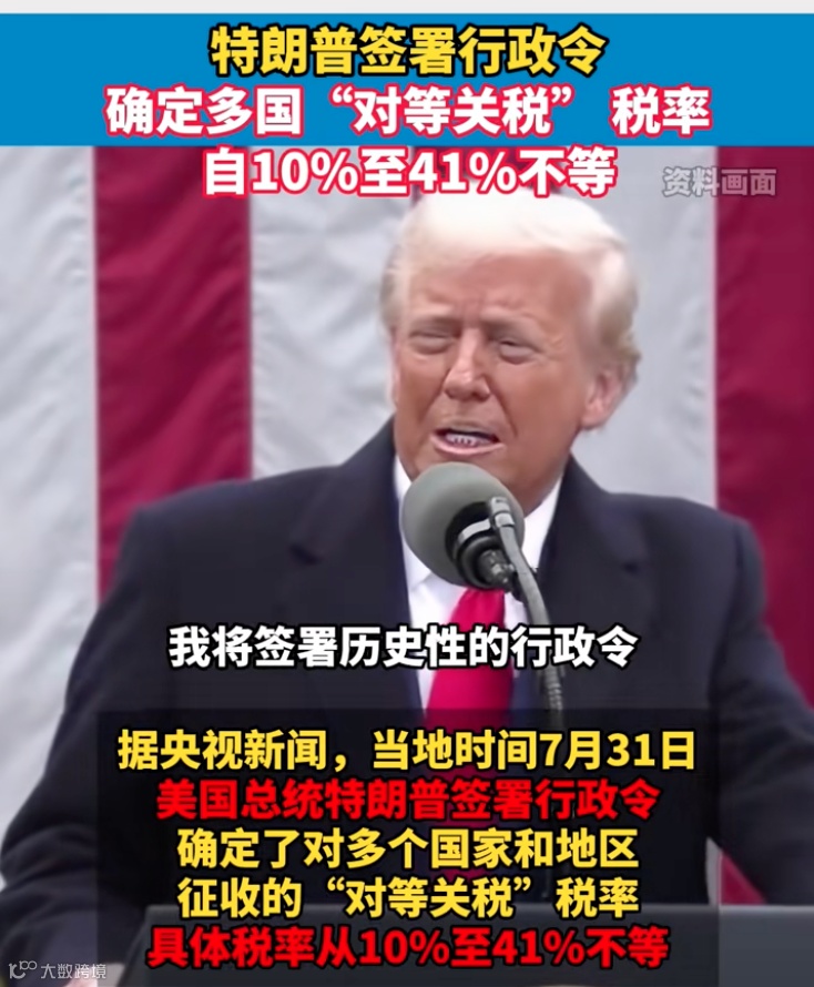 据央视新闻消息,当地时间7月31日,特朗普签署行政令,确定了对多个国家和地区征收的“对等关税”税率,具体税率从10%至41%不等。特朗普进一步修改今年4月发布的所谓“互惠关税”政策,对多国商品调整附加关税税率,以应对美方所称“长期且严重的贸易逆差构成的国家安全紧急状态”。