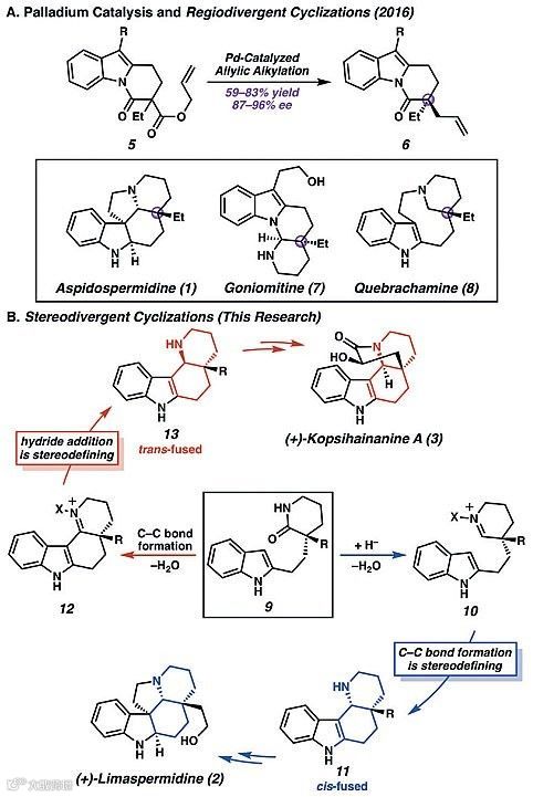 他们设想δ-内酰胺结构9能以Pd催化烯丙基烷基化的产物作为原料两步反应获得,随后9通过负氢还原剂还原和脱水得到亚铵10,进而发生Pictet–Spengler型环化得到具有顺式稠合的八氢喹啉的四环结构11,这样的中间体可以用于进一步合成Aspidosperma 家族的生物碱,如(+)-limaspermidine。而调整合成步骤,先发生C-C键形成,随后形成C-H键,进而通过Bischler–Napieralski型环化便得到稠合的四环亚铵中间体12,负氢还原剂还原得到反式稠合的八氢喹啉的四环结构13,13可用于(+)-kopsihainanine A及其他Kopsia 生物碱的全合成。