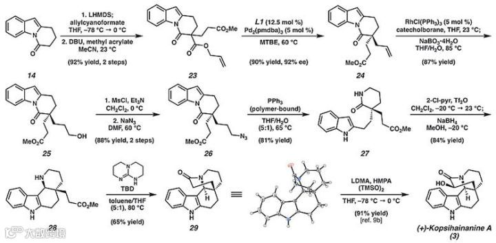 他们还从未取代的DHPI 14出发,通过C-酰基化/Michael加成两步反应,以两步92%的总收率得到中间体23,23在钯催化的条件下进行不对称脱羧烯丙基烷基化反应,以90%的产率和92%的对映选择性得到中间体24。24随后进行铑催化的硼氢化/氧化反应以87%的产率得到醇中间体25,经过简单的两步转化以88%的总产率得到叠氮化物中间体26。26又通过Staudinger还原反应以81%的产率得到内酰胺27产物,27在三氟甲磺酸酐/2-氯吡啶和硼氢化钠的先后作用下以84%的产率得到中间体28,并在TBD的作用下进行环化反应得到中间体29,该化合物的构型通过X射线单晶衍射进行确定。29在LDMA/(TMSO)2/HMPA的作用下以91%的产率完成了(+)-kopsihainanine A的全合成工作。