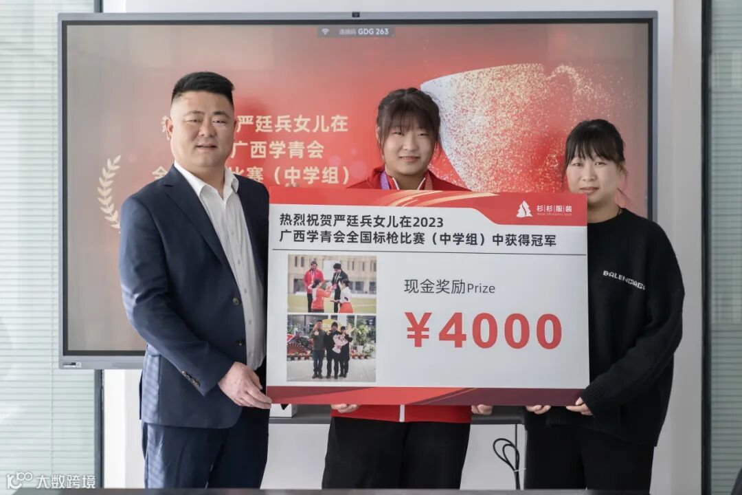 杉杉品牌公司副总裁兼总裁助理同有恒亲切接见,并为严子怡颁发了奖学金。