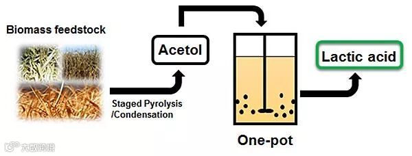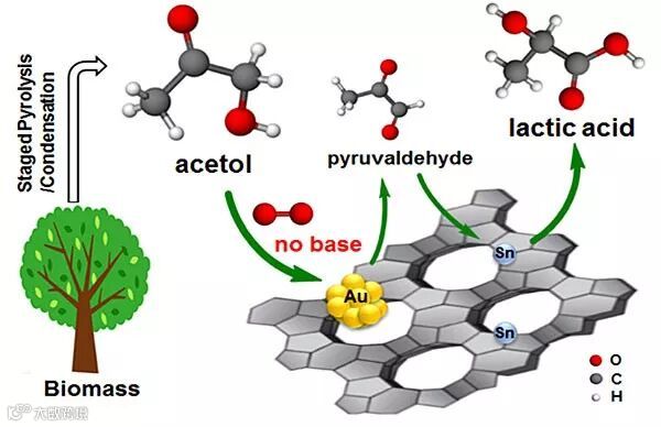 A:我们团队的成员万绍隆副教授在美国Oklahoma大学工作期间主要从事生物质催化快速热裂解、多级热裂解制备液体油品的相关研究工作。快速热裂解一步得到的产物复杂,不易催化改性,因此一种理想的方式是在不同的反应条件(温度、时间、助剂等)下进行多级热裂解。第一级低温裂解主要得到半纤维素的裂解产物(羟基丙酮、乙酸等),中间阶段得到纤维素的裂解产物(糠醛类/左旋葡聚糖),而高温阶段裂解得到木质素的裂解产物苯酚类化合物。若将各级裂解所有的产物都转化为油品,比如要把低温裂解产物乙酸或羟基丙酮也转化为C5以上的油品分子,则需要先经历C-C键偶联、再氢化去氧等催化过程,不仅过程复杂、氢消耗大、催化设计困难,也不符合现代化工和催化追求的原子经济性和能源经济性。因此,研究者摒弃了一般只将油品作为热裂解最终转化产物的思路,充分依据各级裂解产物的物理化学特性,因地制宜地进行催化设计。第三级的木质素分解产物可以通过直接氢化去氧(HDO)催化改性制成液体燃料;而第一、第二级裂解产物中的小分子含氧化合物,如羟基丙酮、糠醛等则可通过催化设计实现C-O键和C-C键活化的精准调控,高选择性地转化为重要的化学品。该研究就是基于第一级裂解产物中主要的小分子含氧化合物——羟基丙酮,通过针对性的催化设计,以期高效地转化为高价值的有机酸目标产物——乳酸。