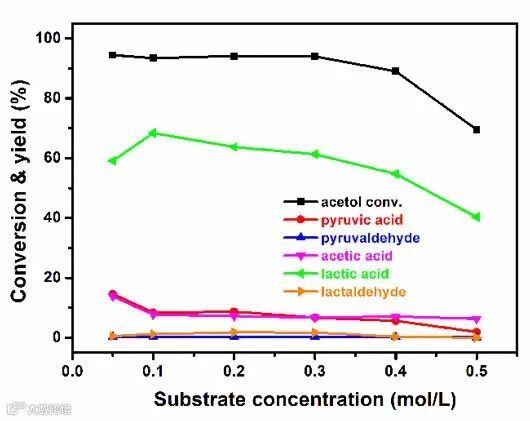 图2. 底物浓度对羟基丙酮转化率和各主要产物收率的影响