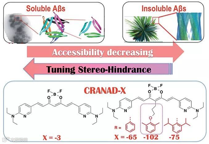 淀粉样蛋白(amyloid β, Aβ)是阿尔兹海默氏症(Alzhemier’s disease, AD)重要的生物标识物之一。患有阿尔兹海默氏症的大脑中存在可溶性Aβ(soluble Aβ, sAβ)与不可溶性Aβ(insoluble Aβ, insAβ)两大类蛋白。早期的理论认为insAβ斑块和沉积物是导致AD的重要原因,对于insAβ,分子探针的研究与开发已经比较成熟。三种可用于检测insAβ的PET分子探针已获得FDA批准,用于检测insAβ的荧光探针也得到广泛的报道。但最新的研究表明,sAβ在AD早期(症状前期)出现,且神经毒性显著高于insAβ。但是,能够选择性地识别sAβ的小分子探针鲜有报道。近年来,麻省总院/哈佛大学医学院Martinos Center分子影像中心的冉崇昭课题组进行了大量Aβ探针的相关研究(J. Am. Chem. Soc., 2009, 131, 15257; J. Am. Chem. Soc., 2013, 135, 16397; Chem. Commun., 2014, 50, 11550; Proc. Natl. Acad. Sci. USA., 2015, 112, 9734),他们发现一些姜黄素衍生物可以同时识别insAβ和sAβ,但缺乏选择性。设计开发sAβ选择性的探针具有非常大的挑战性,因为至少有三个方面的困难需要面对。目前鲜有Aβ晶体结构可以用于合理的分子设计(CAD),可提供经验的文献很少,而最大的困难是组成sAβ/ insAβ蛋白的β片层单体结构完全相同。可以想象,常规的药物设计策略较难解决问题。然而,抗体可用于选择性识别insAβ和sAβ,这是因为insAβ和sAβ空间结构的差异为抗体提供了选择性识别的基础。受到这一事实的启发,冉崇昭课题组与中国药科大学药学院的李玉艳课题组合作,采用调节近红外小分子荧光探针立体位阻的策略,实现了选择性检测sAβ蛋白,这一策略也有望用于其他种类淀粉样蛋白的研究。