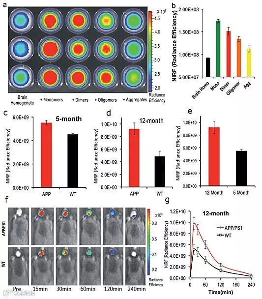 (a) Phantom imaging of brain homogenates with CRANAD-102 in the presence of different Abs (triplicates); (b) Quantitative analysis of theimages in (a); In vivo NIRF imaging with CRANAD-102 to detect the differences between AD mice and WT mice, and AD mice at different ages; (c) TheNIRF signal of CRANAD-102 from 5 month old APP/PS1 mice and WT mice at 30 minutes after IV injection; (d) NIRF signal of CRANAD-102 from12 month old APP/PS1 mice and WT mice at 30 minutes after IV injection; (e) NIRF signal of CRANAD-102 from 5 month and 14 month old APP/PS1 mice at 30 minutes after IV injection; (f) representative images of the in vivo imaging of 14 month old APP/PS1 and WT mice at 0, 15, 30, 60,120, and 240 minutes after IV injection of CRANAD-102; (g) Time-course curves of NIRF from CRANAD-102 in APP/PS1 and WT mice.