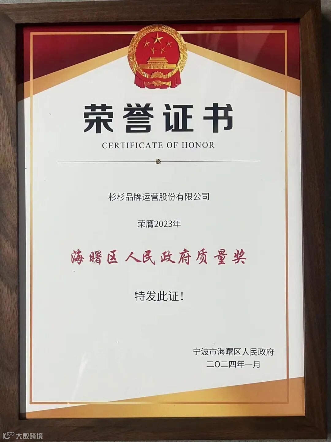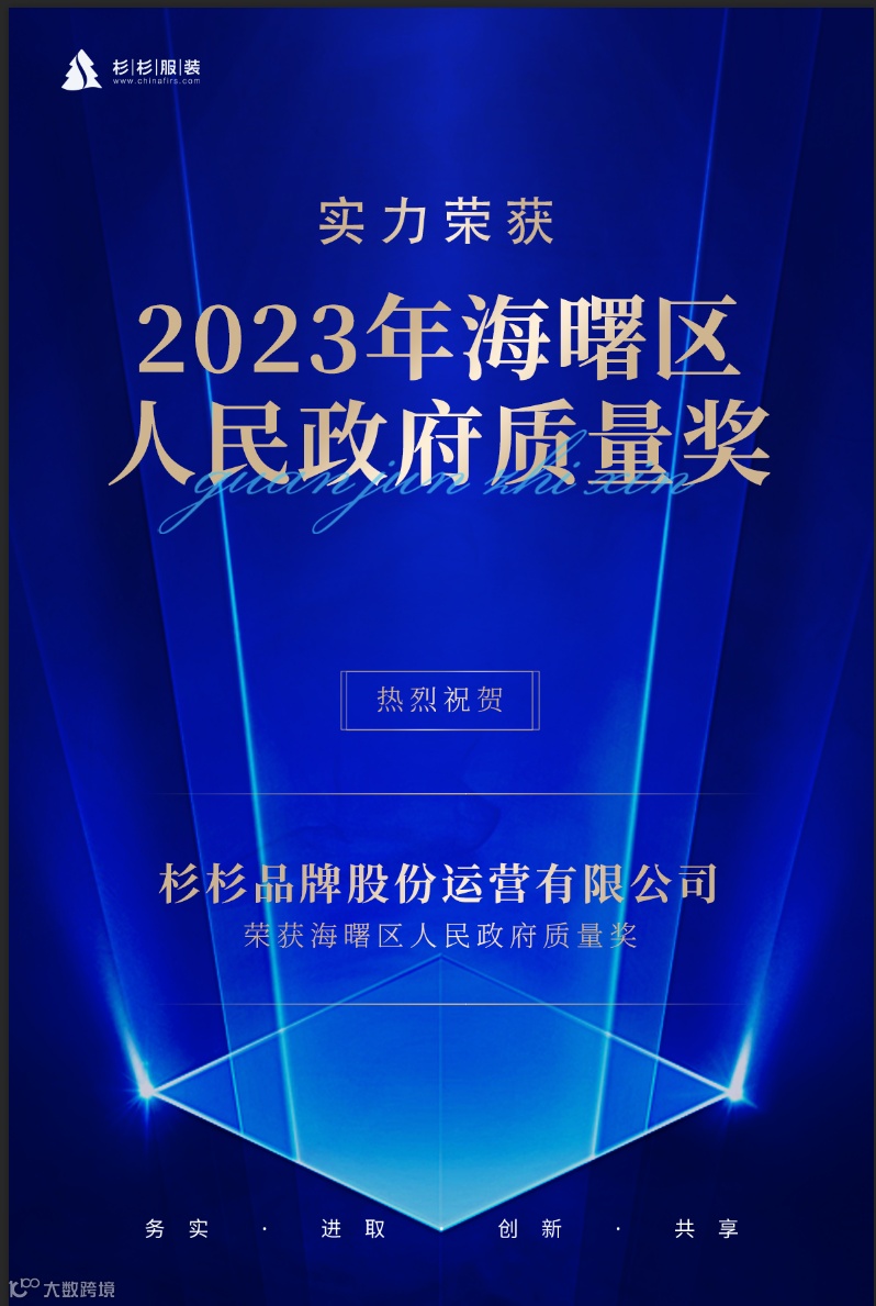 杉杉品牌运营股份有限公司荣获“2023年海曙区人民政府质量奖”。