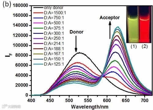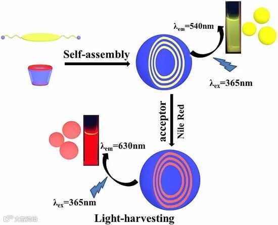 研究发现,含氰基的对苯撑乙烯类衍生物具有很好的聚集诱导发光(AIE)性质,体系中加入磺化环糊精,可以提高聚集诱导发光的特性及水溶性。他们使用主客体组装构筑的荧光超分子组装体作为给体,疏水的尼罗红染料载入超分子组装体的疏水层作为受体,当给受体比例为1500:1时,即可实现明显的荧光共振能量转移;当给受体的比例为125:1时,可以获得很高的天线效应值(天线效应值为32.5),实现高效的荧光共振能量转移。这一研究成果在模拟自然界的光合作用方面具有重要的意义。相关工作发表在Advanced Materials 上。