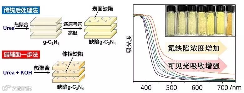 然而目前g-C3N4在光催化反应中仍然面临禁带宽度较宽等问题的困扰。采用热解法合成的g-C3N4通常具有较宽的禁带宽度(~2.7 eV),仅能吸收可见光中很少部分的短波长光。如何对其能带结构进行调控,进而拓宽可见光的吸收能力,充分利用占太阳能总能量>40的可见光部分成为该领域的研究热点之一。研究发现,在g-C3N4的三嗪结构单元中引入氮缺陷是解决上述问题的有效途径之一。但已报道的引入氮缺陷的方法通常涉及多步操作以及苛刻的反应条件(如还原氛围下高温处理等),实验过程危险且难以大规模应用。更重要的是,其产生缺陷多为不均匀的表面缺陷,而且缺陷程度难以调控,这对于精确调控g-C3N4的能带结构是十分不利的。