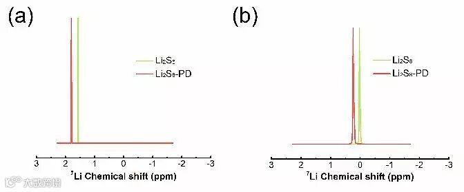 作者进一步对含有吡啶氮的石墨烯模型分子作用前后的7Li NMR进行了理论预测和实验测量。结果显示,在与吡啶氮结合后,7Li的NMR峰化学位移向低场移动了0.3 ppm,计算值和实验值很好地吻合。这一结果充分说明锂离子周围的化学环境发生变化,证明了“锂键”的形成,锂硫电池正极界面的相互作用因此得到很好的定量化描述。
