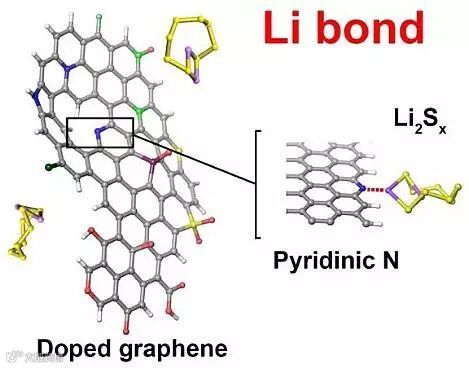 研究人员首先采用量子化学的计算方法对含有吡啶的石墨烯模型分子中氮原子与多硫化物之间的相互作用进行了理论分析。计算表明,吡啶的氮位点与多硫化物的锂离子之间存在较强的偶极-偶极相互作用,形成所谓的“锂键”。而石墨烯上共轭π电子的给电子效应可以进一步增强这种相互作用。石墨烯进行氮掺杂后结合能增强的原因主要是吡啶氮原子的引入使碳材料表面极化产生偶极,与极性的多硫化物形成偶极-偶极静电相互作用,从而形成类似氢键作用的“锂键”。