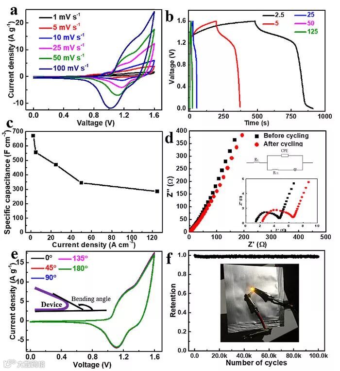 图2. 电化学性能的表征:(a)不同扫描速率下的循环伏安曲线;(b)不同电流密度下的充放电曲线;(c)比容量;(d)电化学阻抗谱曲线;(e)不同弯曲角度的循环伏安曲线;(f)循环性能图。