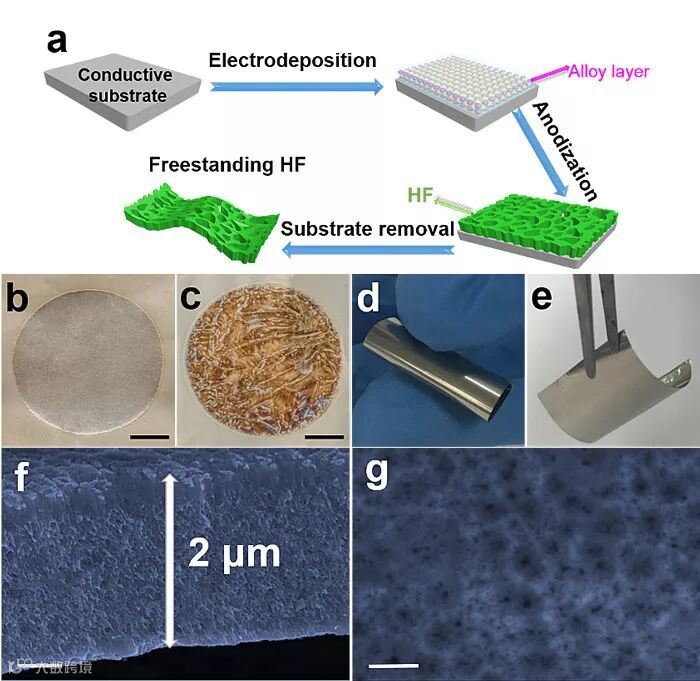 图1.(a)材料制备流程图;(b, c)阳极氧化前后的对比图;(d, e)薄膜柔性和磁性特征;(f, g)断面和表面的SEM图像。