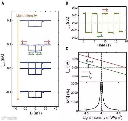 如上所述,MSP器件在光、磁复合场作用下,输出电流与复合电流相异的自旋相关性是实现全新自旋器件功能性的关键。如图3A所示,MSP器件的输出电流可以通过辐照光强度进行调控,但磁响应电流的绝对数值(∆I )并不发生变化。在一个特殊的光照范围内,将I-B 曲线延伸到电流零点(因此IP为正,IAP为负),则电流方向的变化取决于磁场(图3A)。当光强为4.67 mW/cm2时,可得IP=-IAP,此时的MSP器件可作为一个完美的单器件磁控电流转换器(图3B)。基于图3C中光强对输出电流的大幅调控能力,MSP器件的MC值在特定光强下甚至可趋于无限大,这一独特的器件功能或可被应用于光、磁复合场传感等领域。