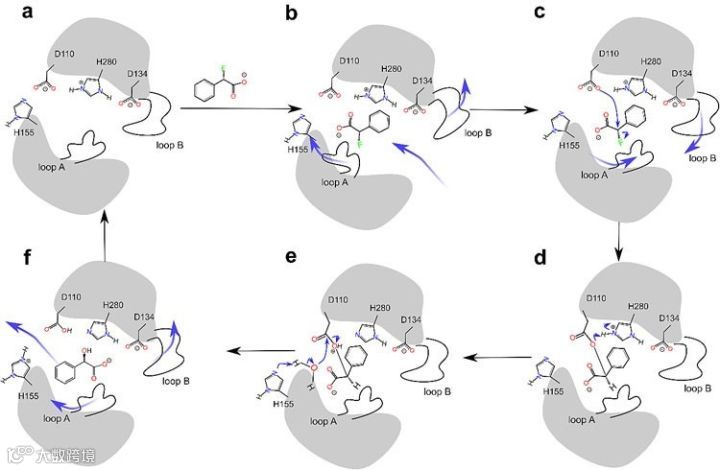 图1. 氟代乙酸水解酶催化α-氟代苯乙酸脱氟的机理