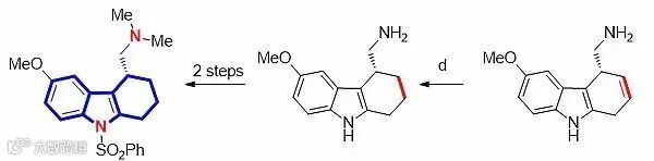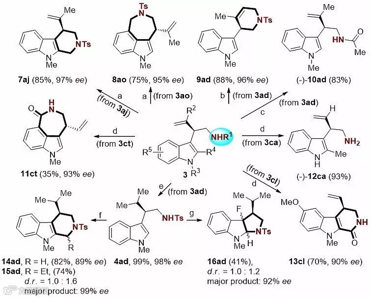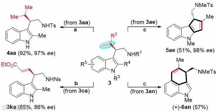 相比于普通的色胺,作者设计合成的手性β-烯基色胺合成子由于烯基的引入极大地提高了这类合成子转化为手性优势吲哚骨架的可能性。这一类合成子通过简单的转化可以构建多达11种优势吲哚骨架(Scheme 3和4)。