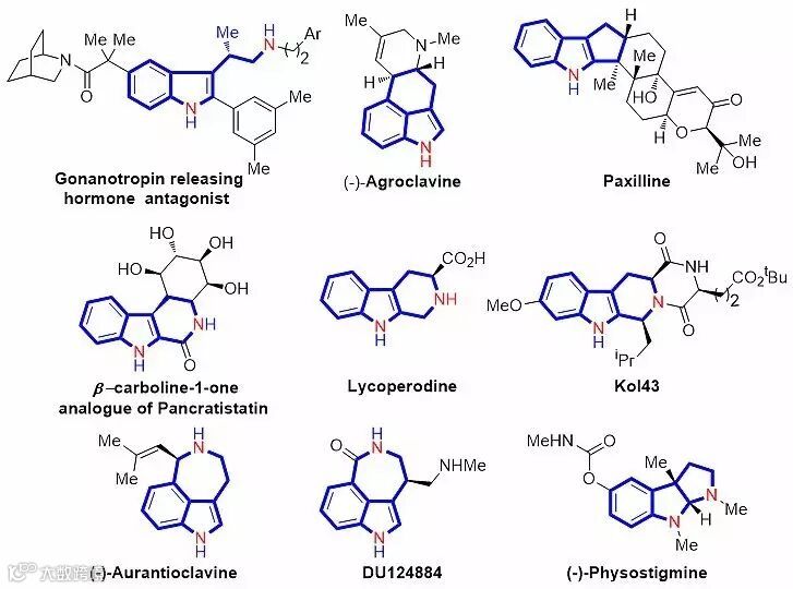 取代的色胺、吡咯并二氢吲哚、吖庚因并吲哚和1,2,3,4-四氢咔唑等吲哚类生物碱骨架广泛存在于具有显著生物活性的天然产物和药物分子中(Figure 1)。因此,发展高效的方法实现该类骨架的构建,尤其是对映选择性的合成备受合成及药物化学家的关注。传统的合成思路是构建不同的手性合成子实现相应吲哚类生物碱分子的构筑。相比之下,如果可以设计合成一类新的手性合成子,进而多样性地构建一系列光学纯、骨架结构各异的吲哚生物碱则具有明显的优势。这类方法学的发展对实现吲哚类功能分子库快速、高效的建立具有重要意义。