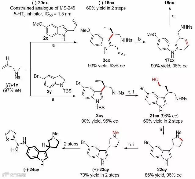 为了体现该类合成子在构建光学纯的优势吲哚生物碱骨架中的重要性,作者还利用发展的方法学成功实现了两种药物分子的合成:5-HT6受体抑制剂MS-245的类似物(-)-20cx和具有偏头痛治疗效果的分子(-)-24cy的不对称合成(Scheme 5)。值得一提的是,目前对24cy的高级中间体(+)-23cy的不对称合成只有一例报道,即2011年加拿大蒙特利尔大学Hanessian教授等报道的从5-溴吲哚出发以有机分子催化吲哚的不对称傅克烷基化反应为关键步骤,经10步以33%的总收率和92%的ee值制备(+)-23cy(Org. Lett., 2011, 13, 840)。而利用张俊良教授发展的方法则可以6步34%的总收率和96%的ee 值更高效地合成目标产物。