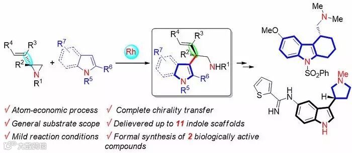 最近,华东师范大学的张俊良教授研究团队通过对一价铑与烯基氮杂环丙烷氧化加成生成的铑-氮杂四元环中间体的证实,分别发展了立体专一性的烯基氮杂环丙烷与炔或烯的分子内杂[5+2]环加成反应,烯基氮杂环丙烷与炔、炔胺、联烯或联烯胺的分子间[3+2]环加成反应,烯基氮杂环丙烷与1,3-偶极子的分子间[3+3]环加成反应,烯基氮杂环丙烷与共轭双烯的分子间[3+4]环加成反应及其与炔的分子间杂[5+2]环加成反应(Scheme 1)。近日,该研究团队的冯见君博士(校晨晖学者)与林桃燕(博士研究生)等基于该小组前期的工作,通过“手性转移”策略,以铑催化的烯基氮杂环丙烷与吲哚的立体专一性开环反应合成了一类新型光学纯的手性β-烯基色胺合成子。该反应以商业易得的[Rh(NBD)2]+BF4-作为催化剂,对各种取代的烯基氮杂环丙烷、吲哚或吡咯底物表现出很好的底物兼容性,烯基氮杂环丙烷原料的手性可完全转移至产物中。此外,该反应还具有反应条件温和、速度快等优点(Scheme 2)。