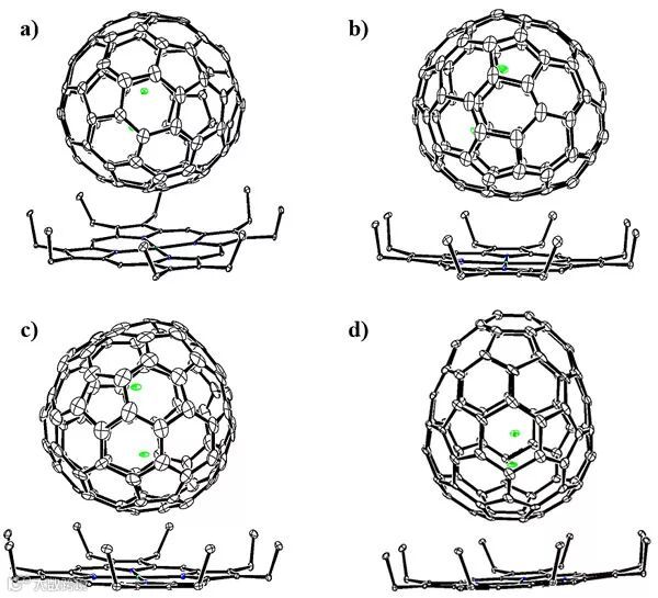 (a)Lu2@Cs(6)-C82、(b) Lu2@C3v(8)-C82、(c) Lu2@D2d(23)-C84 以及(d) Lu2@C2v(9)-C86 的单晶结构