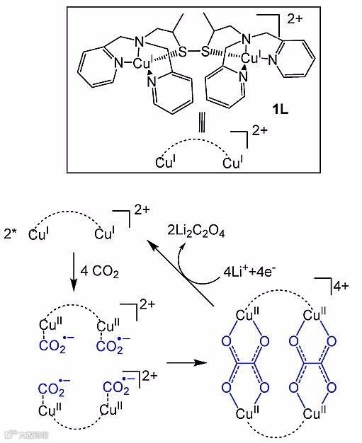 钟龙华课题组提出了一种新的反应机理,其中一分子的二氧化碳首先被两分子的铜(I)催化剂协同还原为一种新的混合价态Cu2(I/II)(CO2•–)自由基负电荷中间体(与生物铜蛋白CuA中心的混合价态类似),随后这一中间体中二氧化碳的碳原子孤对电子在金属催化剂的辅助下,亲核进攻另一分子二氧化碳的碳原子,从而生成稳定的双核铜(II)草酸盐。计算结果揭示了新的机理涉及复杂的电子结构,其中包括一种闭壳层电子结构的反应物以及两种开壳层电子结构的偶联过渡态和产物。另外,计算表明较长的铜-铜距离有利于草酸的生成并抑制常见的碳酸盐生成。