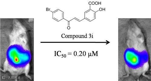 山东大学的李敏勇和谷立川教授设计并合成了一系列羧基查尔酮类化合物,这些化合物对重组萤火虫萤光素酶表现出较强的抑制作用,其中九种化合物对萤火虫萤光素酶的抑制活性高于阳性对照白藜芦醇,其中活性最高的化合物IC50达到0.69 μM。转染萤火虫萤光素酶的人卵巢癌细胞ES-2时,同样有九种化合物对萤火虫萤光素酶的抑制活性高于阳性对照白藜芦醇,其中活性最高的化合物IC50为24.36 μM。转基因鼠体内活性试验表明,通过尾静脉注射活性最高的化合物3i,转基因鼠全身生物发光的强度具有明显的降低,抑制率为18.8%,而白藜芦醇对照组的抑制率为10.1%。因此在活体内,该化合物相对于阳性对照具有更强的生物发光抑制作用。此外,得到的最优化合物3i和萤火虫萤光素酶共晶为进一步理解化合物3i和萤光素酶的结合模式提供了结构基础。