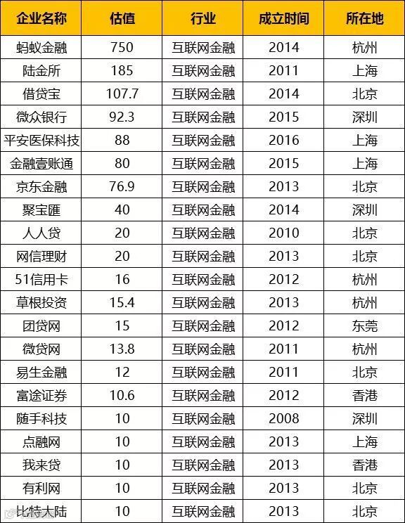 据统计,此次榜单共164家企业上榜,总估值6284亿美元,排名前十的分别是蚂蚁金服(750亿美元)、滴滴出行(560亿美元)、小米(460亿美元)、阿里云(390亿美元)、美团点评(300亿美元)、宁德时代(200亿美元)、今日头条(200亿美元)、菜鸟网络(200亿美元)、陆金所(185亿美元)、借贷宝(107.7亿美元)。
