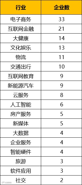 按行业统计,“独角兽”企业最多的前五大行业分别是电子商务33家、互联网金融21家、大健康14家、文化娱乐13家、物流11家: