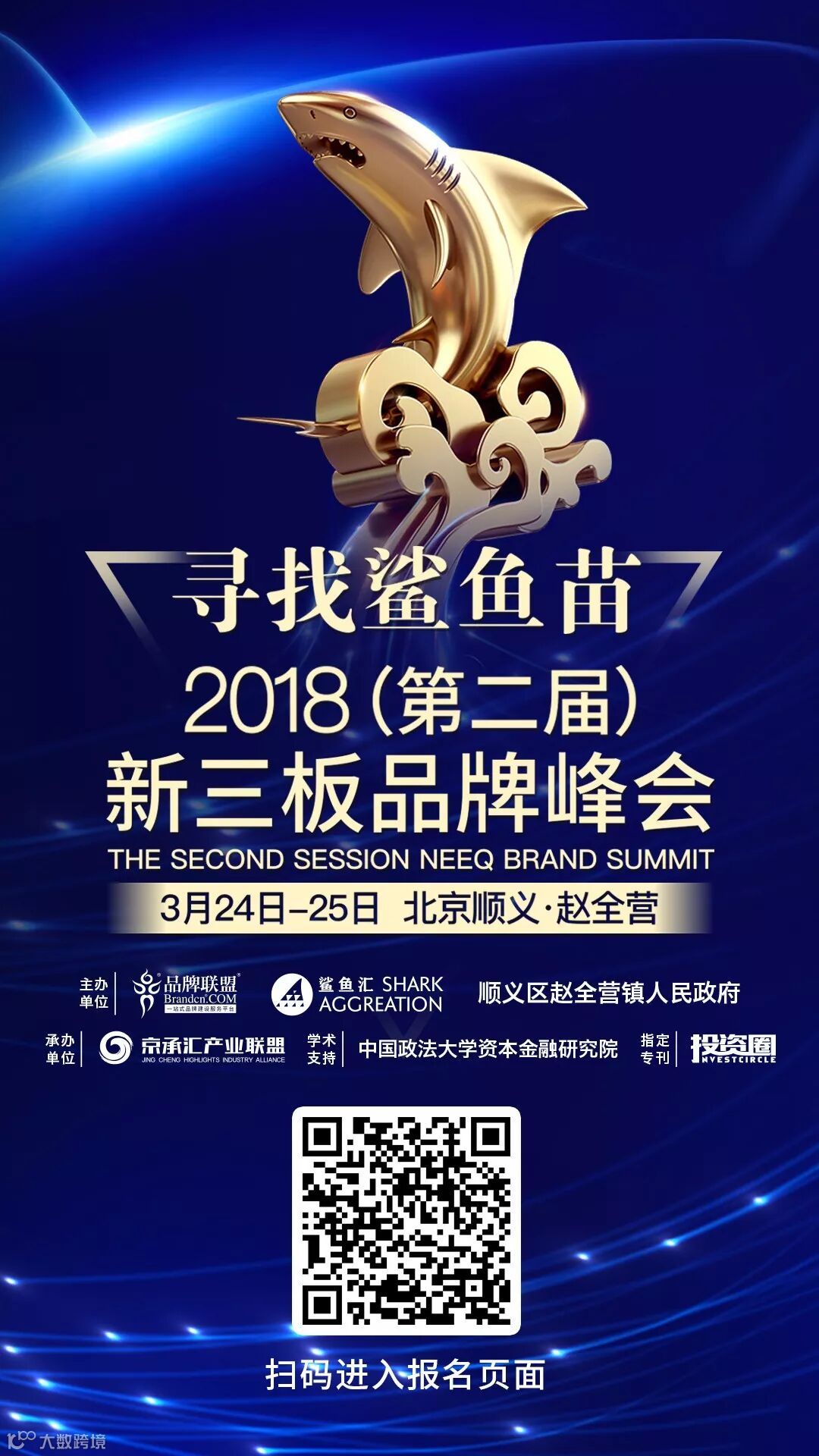 2018年3月24-25日,“寻找鲨鱼苗”2018(第二届)新三板品牌峰会将在北京顺义和园景逸大酒店举行。本次峰会由品牌联盟(北京)咨询股份公司、新三板品牌联盟、赵全营镇人民政府主办,京承会产业联盟承办,北京顺义赵全营兆丰工业开发中心为本活动支持单位,中国政法大学资本金融研究院提供学术支持。第一路演、经典调频北京FM969、挖贝网为协办单位。
