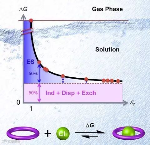 实验测定、量化计算与理论推导三者一致阐明了溶液中阴离子识别的驱动力分配。静电作用虽然主导了结合能,但是因为介电屏蔽其在实际溶液中的贡献随介电常数增大而越来越小。拿Triazolophane•Cl–举个例子,在非极性的氯仿中,静电作用的实际贡献已经降到了50%(图4)。其他作用,例如诱导,色散及排斥等短程作用在实际中的贡献与溶剂相对无关。要指出,因为Triazolophane几乎不带偶极矩,否则诱导作用也可与溶剂相关。