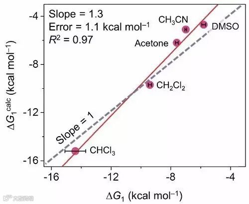 为了进一步阐明介电常数的影响,Flood教授与Raghavachari教授合作使用电子密度泛函理论(Density Functional Theory, DFT)配合内隐溶剂化模型尝试计算溶液中Triazolophane•Cl–的结合能。在5个纯溶剂中计算结果与实验几乎达到了1:1的线性关联(图5)。其中,内隐溶剂化模型将溶剂描述为一个连续介质,其物化性质主要由介电常数表征。