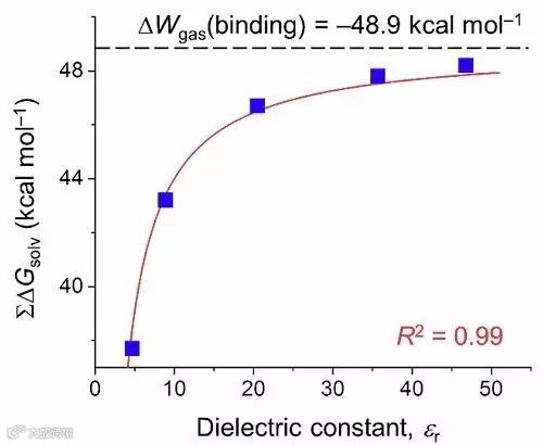图6. Triazolophane•Cl–结合能中静电作用能的拟合。纵轴是去溶剂化能,横轴是介电常数。假设连续介质,静电作用能数值上等于无穷大介电常数时的去溶剂化能。图片来源:Chem