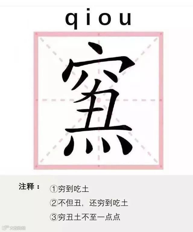 “qiǒu”,由“穷”字与“丑”字相结合,字面意思为“又穷又丑”,“一穷二白”,同“糗”。