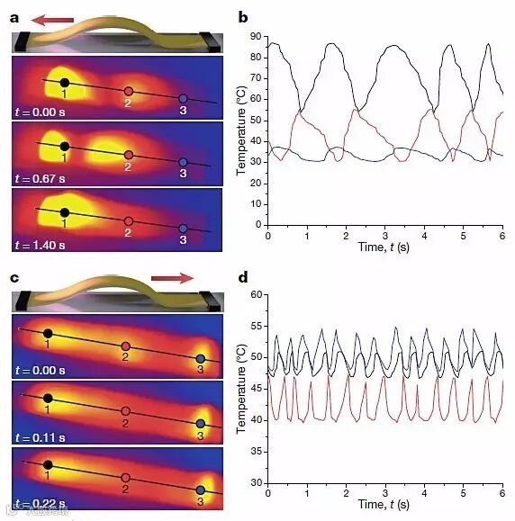 薄膜各处在紫外光照下的温度变化趋势,分子平行面受光(a、b),分子垂直面受光(c、d),黑、红、蓝分别表示1、2、3处的薄膜温度。图片来源:Nature
