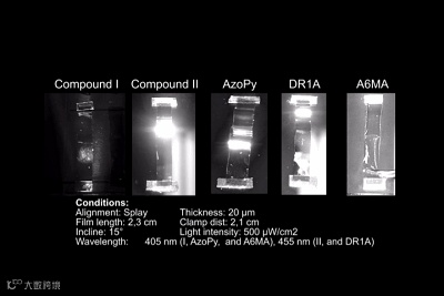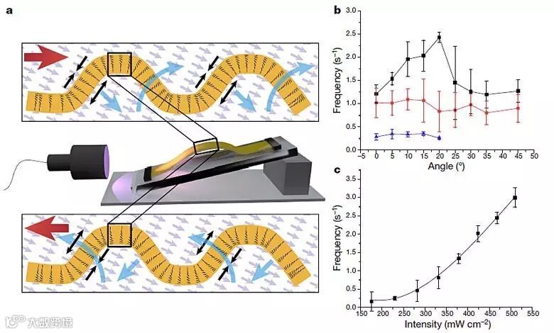 当薄膜两端都固定在基底上并用紫外进行照射时,薄膜会产生一种蛇形的连续波,同时这种波的频率和方向与薄膜接受光照的面的偶氮苯衍生物排列有关——当平行面接受光照时,波向着光照方向运动,波动频率高达2.5 s-1;当垂直面接受光照时,波逆着光照方向运动,波动频率仅为0.8 s-1。具体原因如下:光照时平行排列的分子导致薄膜沿长度方向剧烈收缩,因此光照部位向下弯曲;垂直排列的分子使薄膜沿厚度方向剧烈收缩。由于形变导致的自遮蔽效应使得不同部位交替接受光照,从而产生了连续的波动。同时,光照的角度以及强度都影响着波动的频率。此外,与前期作者的猜想一致的是,光照的部位温度显著升高,薄膜的各处的温度变化与波动完美吻合。