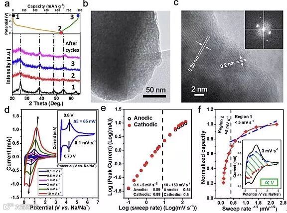 作者进一步探索了单晶介孔二氧化钛-石墨烯复合材料的电化学储钠机理,发现该复合微纳米结构在多次电化学脱嵌钠离子之后仍可以维持结构完整性。此外,该复合材料表现出优异的赝电容(pseudocapacitance)特性,是实现高倍率、长寿命电化学储能的关键。该工作加深了对二氧化钛基储钠材料的认识,同时提供了一种通过微纳米结构复合材料开发高性能储能机器的有效思路。