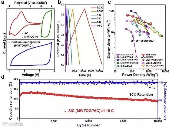 作者以该单晶介孔二氧化钛-石墨烯复合材料作为负极、商业活性碳作为正极,开发出高性能的非对称钠离子电容器。该电容器采用有机电解液,具有较高的工作电压(1-3.8 V)。与传统的锂/钠离子电池和电容器相比,基于介孔单晶二氧化钛-石墨烯复合材料的钠离子电容器在能量/功率密度和循环寿命上都表现出一定的优势。该钠离子电容器的性能可通过改进正极碳材料和优化正负极配比得到进一步提升。