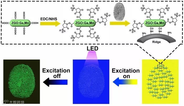 图1. 基于ZGO:Ga,Mn长余辉纳米颗粒的“时间分辨”指纹成像原理示意图。