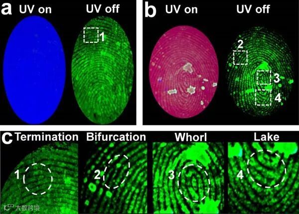 图2. “时间分辨”指纹成像方法消除背景荧光干扰。(a)激发光照射下基底有蓝色背景荧光,激发光关闭后背景荧光消失而ZGO:Ga,Mn纳米颗粒持续发光,由此得到清晰的指纹图像;(b)激发光照射下基底有红色背景荧光,激发光关闭后背景荧光消失而ZGO:Ga,Mn纳米颗粒持续发光,由此得到清晰的指纹图像;(c)指纹的细节特征。