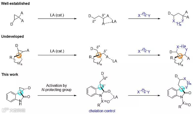 氧化吲哚螺环丙烷是一类具有螺环结构的D-A环丙烷。由于仅具有一个酰胺活化基团,其反应活性并不高。尽管与亚胺的[3+2]环加成反应早已实现并用于天然产物的全合成,但利用这类D-A环丙烷不对称催化构建螺环氧化吲哚尚未实现。华东师范大学的周剑课题组一直致力于螺环氧化吲哚这一重要结构单元的高效不对称催化合成,他们先后发展了一系列构建螺环氧化吲哚的新方法,如重氮氧化吲哚与烯烃化合物的环丙烷化反应(Org. Lett., 2013‚ 15, 42; J. Am. Chem. Soc., 2013, 135, 8197)、串联MBH/溴化/[3+2]环加成反应(Angew. Chem. Int. Ed., 2013‚ 52‚ 13735)以及6π电环化反应(Angew. Chem. Int. Ed., 2014‚ 53, 13740)等。在此基础上,他们发展了引入N-吸电子基团来活化氧化吲哚螺环丙烷实现多样性构建螺环丙烷的策略。N-吸电子基团具有双重作用:稳定过渡态中氧化吲哚C3位的负电荷以及协助形成与金属Lewis酸的螯合作用来加强选择性的控制。