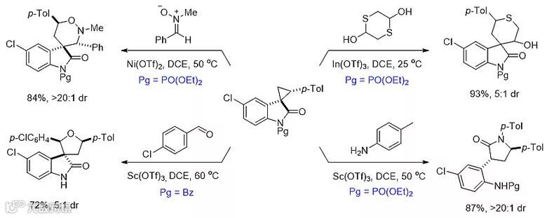 利用“活化”的氧化吲哚螺环丙烷,作者发展了氧化吲哚螺环丙烷与硝酮、二聚巯基乙醛和对氯苯甲醛的环加成反应,实现了新的螺环氧化吲哚的合成以及氧化吲哚螺环丙烷与对甲基苯胺经过开环/环化反应高效合成3,5-二取代-2-吡咯酮的反应。