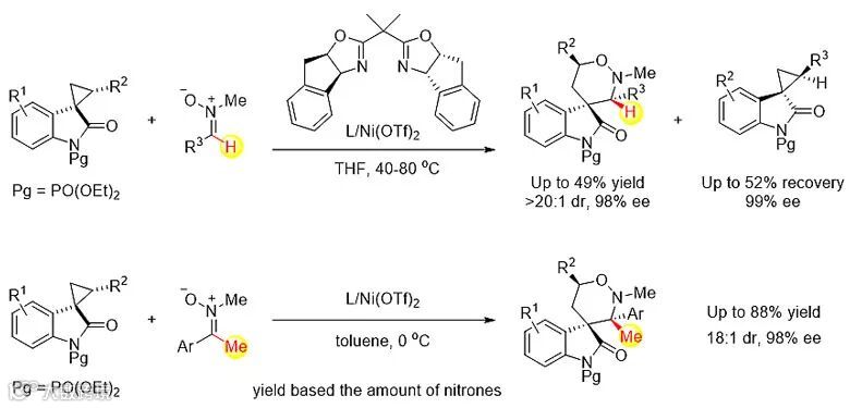 作者同时发展了氧化吲哚螺环丙烷与醛硝酮、酮硝酮的高选择性不对称环加成反应。当使用醛硝酮作为底物时,反应能以高达49%的收率、>20:1的d.r.值、98%的ee 值得到目标产物,同时还能以高达52%的回收率、99%的ee值回收氧化吲哚螺环丙烷。当使用酮硝酮作为底物时,反应能以高达88%的收率,18:1的d.r.值,98%的ee 值得到目标产物。该反应是首例高选择性的氧化吲哚螺环丙烷参与的不对称催化反应,同时也是首例非活化酮硝酮参与的不对称催化反应。