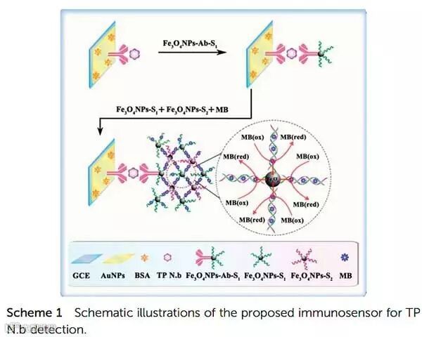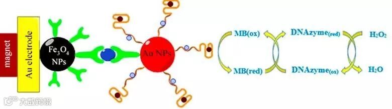 该工作中,探针上修饰了亚甲基蓝和DNA酶(hemin和G四联体组成)。电极表面在过氧化氢存在的条件下,DNA酶可以将还原态的亚甲基蓝氧化,使信号放大。