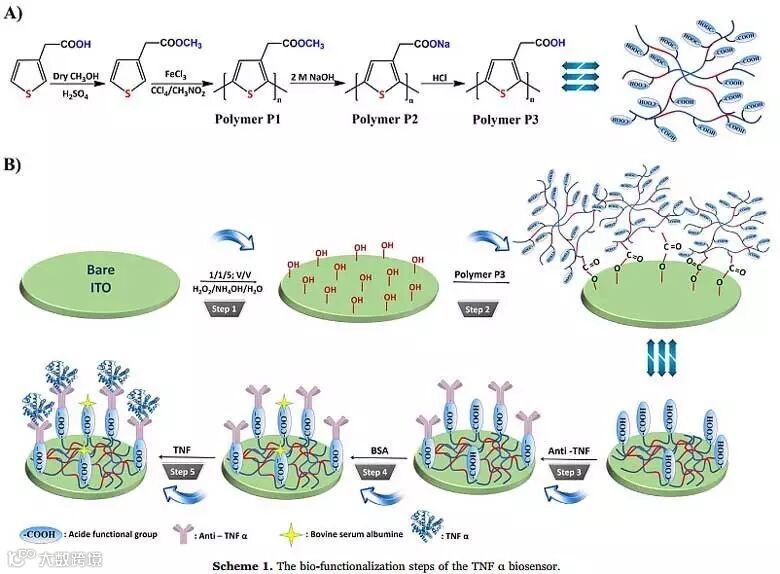 该文使用一种导电高分子(聚3-噻吩乙酸)作为基底,利用高分子中大量羧基固定抗体,增加固定目标物质的活性位点,由此增加固定到电极表面的目标物质。在铁氰化钾溶液中利用CV和阻抗表征,由此得到线性关系。