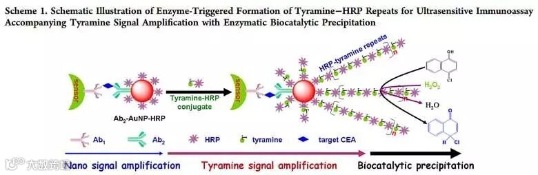 酪胺(tyramine)在自由基氧化的情况下被活化,从而可以与邻近的蛋白质相结合。该工作将酪胺修饰到辣根过氧化物酶(HRP)上,H2O2存在时,溶液中修饰酪胺的HRP可以逐步的结合到探针上,瞬间脑补小时候玩的“接竹竿”(生活与化学也是相通滴!)。然后再将传感器浸泡在含有过氧化氢的4-氯萘酚溶液中,在HRP的催化下4-氯萘酚生成沉淀,增加传感器表面的阻抗,最后检测阻抗值,由此得到目标蛋白质的含量。