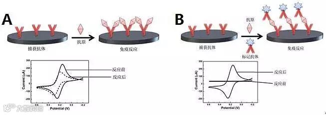 先介绍一些关于电化学免疫传感器的基础知识。对于电流型电化学免疫传感器,有两种模式:非标型电化学免疫传感器和三明治型电化学免疫传感器,如图: