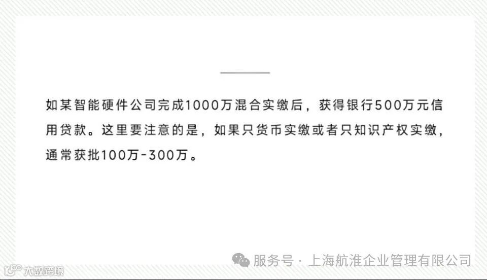 其次,货币实缴还可以增强银行信贷信用,同时知识产权实缴提升企业估值。