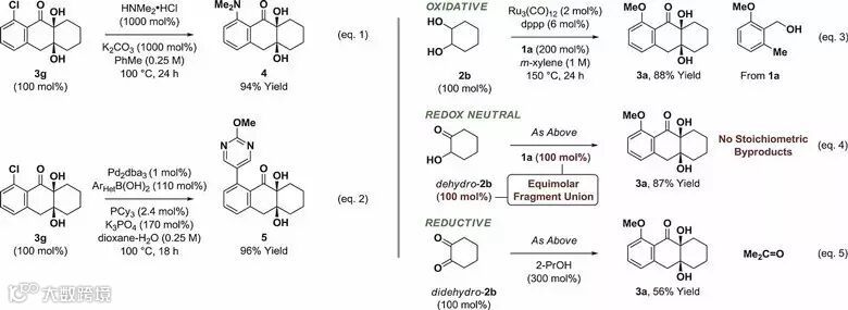 为了证明该反应的实用性,作者对产物3g进行了衍生化研究。芳香亲核取代和Suzuki反应的顺利进行表明产物可进行后续的转化得到其他不同的衍生结构。二醇、α-羟基酮和二酮均可作为原料实现该反应,证明该反应不受氧化还原条件的限制。